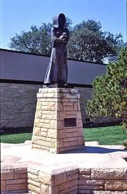 Hardship and Dreams was the title of a sculpture by Dorothy Koelling (1913-2004) unveiled in Wichita, Kansas on June 28, 1994. A newspaper article at that time described the work as being, "inspired by the monumental 'Pioneer Woman' in Ponca City, Okla."[41] Koeling's six foot tall statue depicts the bonneted pioneer woman, carrying a large book/Bible and bundle in her right arm, marching forward with her flatfooted son, whose hand she holds, next to her.[42]