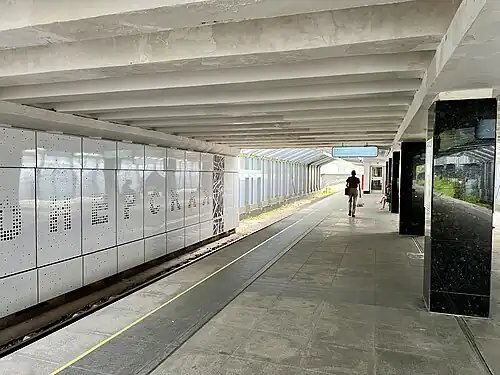 The station sits in a shallow cut, with the platform on the lower level and the street-level vestibule above. A road overpass (providing access to the vestibule) covers part of the platform; the rest is protected only by a narrow canopy. The single row of pillars is faced with white marble and the platform is a plain concrete slab. The architect was Rober Pogrebnoi.