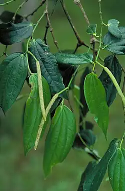 Piper interruptum is a root climber with a maximum stem diameter of 2 cm (0.79 in).[4] The leaves are ovate to narrowly ovate and mostly glabrous.[5] They measure up to 16 cm (6.3 in) long by 8.5 cm (3.3 in) wide, with a cuneate base which is often asymmetric, and an acuminate tip.[4][5] There are 1 to 3 pairs of lateral veins, all of which divert from the midvein in the basal portion of the leaf.[5] Petioles are 1 to 2 cm (0.39 to 0.79 in) long and stipules are 0.7 to 0.9 cm (0.28 to 0.35 in) long.[6]