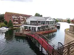 The ait is the third-smallest of those named on official maps of the Thames.[1] Maps show it has clearly approximately kept its footprint measurement of 0.147 acres (590 m2) shortly before the year 1900, though the few rounded corners of its then-boathouse use have been neatly squared since the restaurant's opening.[2] It is accessed on foot by a footbridge and staircase (also known together as a gangway) that connects the island to the centre of Caversham Bridge. The smallest island with vehicular access on the river is almost double its size, Swan Island, London which is in Twickenham.[3][4][5]