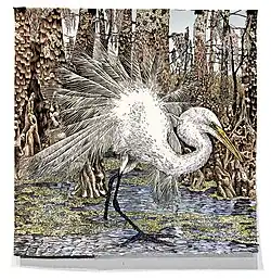 Frisbie-Calder's artistic practice is characterized by her use of various printmaking techniques, including large-scale woodcut prints and silkscreens, alongside interactive installation art. Her environmental work, such as her Canceled Edition series, engages viewers with the unfolding process of species extinction. Her installations invite audiences to observe and understand the gradual disappearance of species, fostering awareness of the ongoing environmental crises. By collaborating with scientists and drawing attention to the role of bioindicators like birds (e.g., in works like 'Egret'), Frisbie-Calder's work emphasizes the urgency of addressing climate change and biodiversity loss.[1][12][13][14] Her work has been featured in a range of publications, including Bayou,[15] Heroine Magazine,[16] Earth Island Journal,[6] American Craft,[2] Country Roads,[17] and a front-cover feature for Current Affairs.[18] Frisbie-Calder was awarded best of show at New Orleans Jazz & Heritage Festival in 2017,[1] and won a grant from ArtPrize with her exhibit Canceled Edition: Ivory-billed Woodpecker.[1]