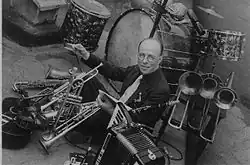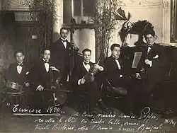 The Orchestra had two fixed members, Gianni Miglio and Luigi Balma, and included many others. Pippo played nine instruments and selected the members of his orchestra with a simple rule: each member must play at least three instruments, read music and play a wide list of songs from memory. The band soon held seven musicians, who played 36 instruments including the mellophone. "Pics of this time show a group of seven performers and all around a huge scenery of instruments, in one of these you can count at least 26: almost four each! It must have been an astonishing show to see them!”.[2]