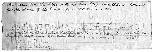 This translation implied that the bone fragments were part of the remains of Gautama Buddha, the founder of Buddhism.[10] The challenge in interpreting a language that was new to all lay in finding uses of less familiar words in other contexts to reach a definition. To make it harder, the hand copies of the inscription were not always accurate. Peppé's original copy had one minor omission but, when he passed it over to his assistant for more copies, other errors were made. Ambitious Pali scholars approached their translations with a passion that led to competition and grandstanding, often when they were working from different texts.[11] Throughout the following decade or so, epigraphists debated the precise meaning of the inscription. Vincent Smith, William Hoey, Thomas Rhys Davids, and Emile Senart all translated the inscription to confirm that these were relics of the Buddha.[12][13]