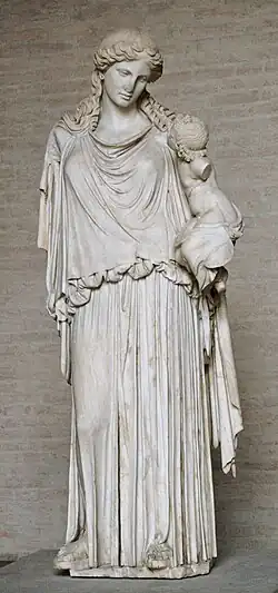 There are currently two theories as to the sculptor of the statue. According to Geoffrey Waywall, the drapery bears similarities to a statue of Eirene holding a baby Ploutos which is thought to have been made by Cephisodotus the Elder. This identification is based on the fact that Pausanias states that Cephisodotus made a statue of Peace and Wealth for the Athenians.[19][20] Pliny the Elder states that Cephisodotus was active during the 102nd Olympiad, which is equivalent to 372-368 BC.[21] This further tallies with the time period in which the Corinthian helmet and heavy peplos style were popular.[22] Waywell identifies what he considers to be multiple areas of similarity between the two statues: