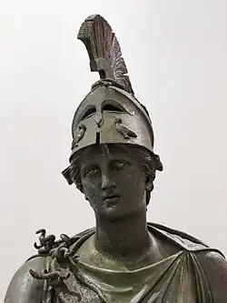 The statue is an over-life sized representation of Athena, with a height of 2.35 meters (approximately 8 feet). She stands contraposto and wears a peplos that is open on the right side. She also wears a Corinthian helmet decorated with griffins on the sides of the helm and owls on the cheek pieces; the crest of the helmet has a serpent wrapped around its base.[1] An aegis is strapped diagonally across her torso, which has a miniature Gorgon's head on it along with a border of snakes. The aegis' small size indicates that it is likely to be a marker of Athena's identity rather than an actual piece of armament.[2] The position of the lower right arm, reached out and palm up, indicates that she was originally holding something. Possibilities as to what it could have been include an owl held out in the hand, a small statue of Nike, or an offering bowl.[3] The idea that the figure could have been an owl, however, is considered unlikely by Olga Palagia, based on the fact that no contemporary statues of a standing Athena show her holding an owl.[4] Her left arm is posed to hold a spear. The cloth of the peplos appears heavy, as evidenced from the deep cloth lines in the sculpture.[5] The attention to detail at the back of the statue and her slight stoop suggest a possibility that she was designed to be placed on a central pedestal rather than against a wall.[6]