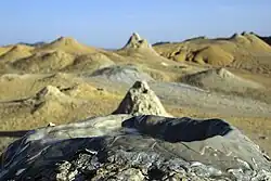 Mud volcanoes are landforms where water and gas are extruded from the ground. In southeastern Iran they occur in two places, one close to volcanoes such as Bazman and Taftan and are hot (70–90 °C (158–194 °F)) effusions, the other is colder and linked to the extrusion of carbon dioxide and tectonic-sedimentary processes.[2] Several theories have been proposed to explain cold mud volcanoes, one of which posits that water in clay is trapped and thus pressurized, causing the clay to liquefy and erupt on the surface along faults. Despite its location close to the two aforementioned volcanoes, Pirgel is considered to be a cold mud volcano,[1] with temperatures of 20.5–30 °C (68.9–86.0 °F).[4]