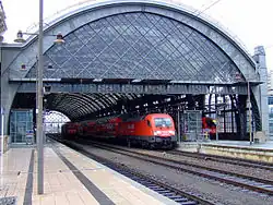 Regional-Express RE 50 to Leipzig in Dresden Mitte; the Regional-Express trains now use the long-distance tracks - Since its reconstruction, platforms 1 and 2 of Dresden Mitte station are used by the S-Bahn. There are no more connections between the S-Bahn tracks and the tracks of the mainline railway, but S-Bahn trains may change between the two tracks of Pirna–Coswig railway line. An interchange to the Dresden tram network has been established immediately next to the station.