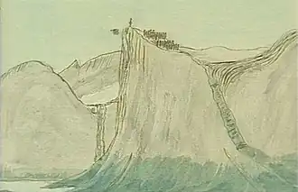 An Inuk and a Viking are said to have climbed to the summit and held a shooting competition with bow and arrow on a seal pelt, stretched on a bank of the fjord. The Inuk won and pushed the loser off the cliff to his death, per the terms of the Viking's agreement.[1][2]