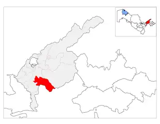 Piskent (Uzbek: Piskent tumani, Пискент тумани[1] or Pskent tumani / Пскент тумани[2]) is a district of Tashkent Region in Uzbekistan. The capital lies at the city Piskent.[2] It has an area of 790 km2 (310 sq mi)[3] and it had 102,000 inhabitants in 2021.[4] The district consists of one city (Piskent), 2 urban-type settlements (Muratali, Said) and 6 rural communities (Oq tepa, Dungqoʻrgʻon, Kelovchi, Murotali, Koriz, Said).[2]