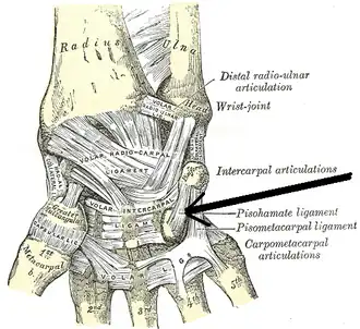 ![]() Ligaments of wrist. Anterior view. (Pisohamate ligament labeled at center right.) | |