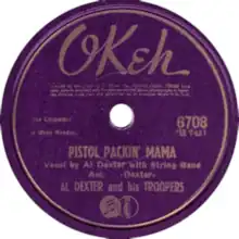 1943 was dominated by a musicians' strike, which since August 1942 had prevented the recording of commercial music by the record companies. As the strike dragged on, the labels began releasing material from their artists' back catalogues, until by mid-1943, that ran out too. Okeh Records released Al Dexter's "Pistol Packin' Mama", backed with "Rosalita", in March. It sold quickly, helped by reports in Billboard magazine and great popularity in jukeboxes, which had run out of fresh material to play. Although Billboard did not publish its first Folk-Hillbilly chart until January 8, 1944, "Pistol Packin' Mama" became the first "Hillbilly" record to reach no. 1 on the National Best Selling Retail Records chart, on October 30, 1943,[8] and spent sixteen weeks in the top 10, on its way to selling 3 million copies.[9][10] It entered the Jukebox chart on July 31, 1943,[11] where it stayed for 28 weeks (the last 14 shared with the Bing Crosby version), another unheard of achievement for a "Hillbilly" tune. In Billboard's 1943 Yearbook, released in September, Dexter's "Pistol Packin' Mama" was the only hillbilly record to join Glenn Miller and Tommy Dorsey in the best-selling record list.[12]