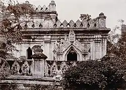 The pitakataik dates to the pre-colonial era. During the Pagan Kingdom era, Anawrahta commissioned a square-shaped pitakataik that measured 51 square feet (4.7 m2), built in the style of a temple with a central plinth surrounded by a corridor, located 150 feet (46 m) from the Tharabha Gate.[1] Subsequent monarchs, including Kyansittha, Htilominlo, and Kyaswa, continued the tradition of building pitakataiks during their reigns, ushering in a tradition of royals and laypersons alike commissioning pitakataiks.[1] By the First Toungoo Empire era, the pitakataik was considered a requisite edifice for a royal capital, and it was built in Bayinnaung's capital of Hanthawaddy (now Bago, Myanmar).[1]