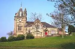 A disastrous fire gutted Moulin Kirk in 1873 and, in addition to restoring this building, a new church was erected on a site in Pitlochry offered by Mr Archibald Butter of Faskally. The new church, designed by Dundee Architects Charles & Leslie Ower was complete by 1884, comprising a mixture of Romanesque Architecture and Victorian Gothic and Byzantine features, inspired by the work of F T Pilkington.[1] A monument commemorating Alexander Duff (1806–1878), the first Church of Scotland missionary to India, is situated in the church grounds. A church hall was constructed in 1910.[2]