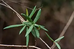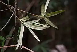 Leaves are narrow, and vary in shape from being lanceolate to slightly ovate.[3][4] They are typically 2–8 cm long and 5-18mm wide, margins are flat or distinctly recurved, with an obtuse to subacute apex.[3] They are alternately arranged along the stem, and, as the name suggests, are most distinct in the contrasting colours of the leaf surfaces. The adaxial surface being a glossy dark green colour, and the abaxial surface being light green to silver-grey in colour. The abaxial surface is heavily coated in fine white hairs, and occasionally the adaxial surface will also have a sparse coating of white hairs.