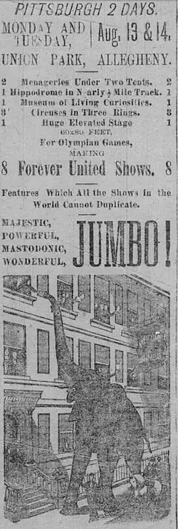 Beyond simply major sporting events, the park often also doubled as a venue for circuses, carnivals, various ethnic and holiday celebrations, and track meets. Before the Exposition grounds were used for major gatherings, Union Park was a main local gathering place that could easily and closely accommodate large crowds for exhibitors. Popular national figures such as Adam Forepaugh and P. T. Barnum would hold their shows here, spending up to three days before moving off to one-night shows in smaller towns. The park sat next to the Pittsburgh, Fort Wayne and Chicago Railway.