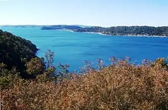 Pittwater extends from Mona Vale and Warriewood in the south, along the eastern ridge of the Barrenjoey Peninsula leading to Palm Beach and along the western ridge of the Lambert Peninsula leading to West Head. The eastern parts of the catchment are largely urbanised whilst the western parts are primarily Ku-ring-gai Chase National Park.[3] Within the Pittwater lies Careel Bay, Refuge Cove, Saltpan Cove, Horseshoe Cove, Crystal Bay, McCarrs Creek, Browns Bay, Elvina Bay, Lovett Bay, Towlers Bay, Portuguese Bay, Coasters Retreat and The Basin.[1] Scotland Island is located within the estuary.