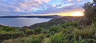 Sunset view west across Pittwater from Barrenjoey Head, showing Ku-ring-gai Chase National Park on the western shoreline.