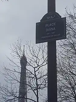 The place is named in memory of Diana, Princess of Wales,[1] by vote of the Council of Paris in 2018.[2] The place is just north of the Pont de l'Alma tunnel, where Diana died in a high-speed car crash in 1997.