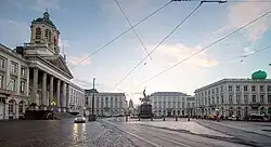 The principal building on the square is the neoclassical Church of St. James on Coudenberg, consecrated in 1787, and designed by Gilles-Barnabé Guimard after the designs of Jean-Benoît-Vincent Barré.[21][29] It succeeds two neighbouring places of worship: the chapel of the Coudenberg Palace and the Coudenberg's abbey church, both demolished by command of Charles Alexander of Lorraine during his expansive urban planning projects, despite having escaped the great fire of 1731 that destroyed the palace.[8] The first stone was solemnly laid by Charles Alexander of Lorraine on 12 February 1776, and the portico was finished in 1780. The nave, transept, choir and sacristy were built under supervision of Louis Montoyer in 1785–86.[21][29]