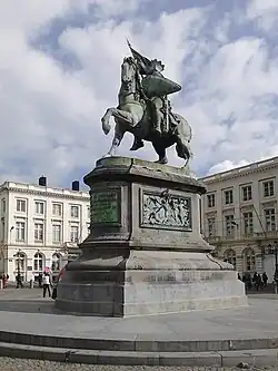 Remaining empty for several decades, from 1848, the centre of the square was once again occupied by a monument (still present today), an equestrian statue of Godfrey of Bouillon,[4] built at a time when the young Belgian State was in search of patriotic landmarks.[17] The blue stone posts connected by iron chains that originally lined the square disappeared in the middle of the 19th century and were replaced by pavements.[4]