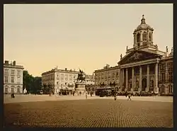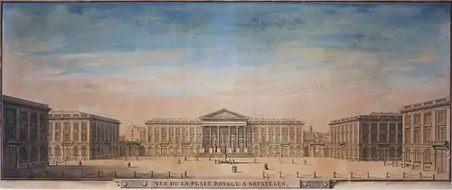 It was only in 1774 that Prince Charles Alexander of Lorraine, Governor-General of the Austrian Netherlands, proposed replacing the ruins with a monumental royal square inspired by French models such as the Place Stanislas in Nancy (1755) and the Place Royale in Reims (1759), of which it is almost an exact replica.[3][12][13] The project was approved that same year by Empress Maria Theresa of Austria, who authorised the demolition.[14] If at the beginning, this space, intended to be decorated with a statue of the governor, was sometimes called the Place de Lorraine ("Lorraine Square") in his honour, it is finally the name Place Royale ("Royal Square") that was retained, according to the predominant model in France, which appeared more suitable to represent political power.[15]