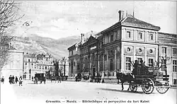 • N°9: musée-bibliothèque de Grenoble: the building, which housed the municipal library until 1970 and the museum collections until 1993, was designed by the architect Questel in a neo-Renaissance style. It was inaugurated in 1872 after several years of work interrupted by the Franco-German war of 1870. The main facade, on the Place de Verdun, is decorated with six sculptures protected in niches and created by the Grenoble sculptor Henri Blanc-Fontaine. These represent on the left side the allegories of Painting, Architecture and Sculpture and on the right side, the allegories of Poetry, Science and History.[10]