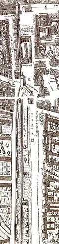 However, Renaud de Forez and his successors continued the works undertaken by the bourgeois of Lyon, in order to protect the city from a potential attack by the Dombes. A two-metre-thick and ten-metre-high new wall was built between the Saône and Rhône. Approximately 500 metres long, this enclosure was pierced by two gates defended by drawbridges (the Porte de la Pêcherie on the Saône and the Porte de la Lanterne) and protected by ten towers. A crenelated walk and five stone booths allowed soldiers to watch at the top. The main wall was separated by a 22-metre ditch from another two-metre wall located to the north. In the fourteenth century, a third structure built into the slope was added, then, at the beginning of the 15th century, a new structure was built on the Saint Sébastien hilltop, consisting of a mound of earth protected by wood towers.[2] In case of siege, the ditch, which was called Terralia nova (Fossés of Terreaux) or Fossés de la Lanterne, could be filled with water. This one entered when needed in a succession of basins, called the Neyron channel, dug laterally to the Rhone.