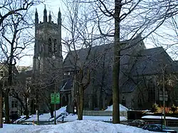 In 1869, St. George's Anglican Church was built on the along the western side of the plaza, which was a former Jewish cemetery that had also relocated to Mount Royal, near the entrance of the Mount Royal Cemetery. Soon, many other Protestant denominations would build churches in the same area—beginning the trend that would establish the site as a prestige address.