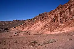 Red Cathedral is a geological formation located between highways 178 and 190. Formed of steep cliffs, it is composed of red colored oxidized rocks and is visible from Zabriskie point and the Golden Canyon trail.