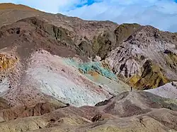 Artist's Drive rises up to the top of an alluvial fan fed by a deep canyon cut into the Black Mountains. Artist's Palette is an area on the face of the Black Mountains noted for a variety of rock colors. These colors are caused by the oxidation of different metals (iron compounds produce red, pink and yellow, decomposition of tuff-derived mica produces green, and manganese produces purple).