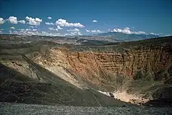 Ubehebe Crater is the largest of more than a dozen of in the Ubehebe Craters field. As groundwater exploded into steam due to the heat of magma underneath, an empty pit was left behind and the debris spread around the field. Erosion over the millennia since the eruption revealed multi-colored stripes on the crater walls dating to the Miocene. Visitors can hike on trails to the bottom or around the rim.