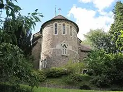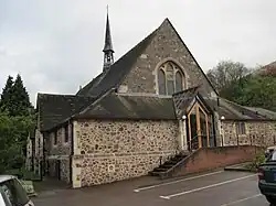 All Saints remains as one of two C of E churches in Malvern Wells following the closure of St Peter's Gothic style church designed by Robert Jearrad (1836).[6] Built in 1930 in 13th-century style in Malvern rag-stone by architect Troyte Griffith of Nevinson & Newton,[6] to whom Sir Edward Elgar dedicated an Enigma Variation,[7] it is located on steep sloping common land donated by Lady Emily Foley, it has a semicircular apsidal chancel which demonstrates the architectural challenges of east-facing chancels on the flanks of the Malvern Hills, and an organ by Nicholsons.