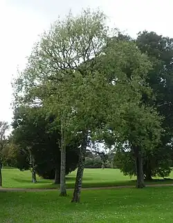 The juvenile form has bushy interlacing branches with small leaves, while an older tree will tend to have larger leaves, sometimes with the lower parts of tree still displaying divaricating leaves. A profusion of small white or green flowers appear in dense clusters in spring making it easier to distinguish from the similar lacebark genus. One of the distinctive aspects of this tree is that it is usually deciduous which is unusual for New Zealand, although in the northern areas it can be semi-deciduous.[3] It is considered the largest of New Zealand's deciduous trees growing to 17 metres,[4] and grows in the North, South and Stewart Islands. A subspecies from the Chatham Islands, Plagianthus regius subsp. chathamicus, is very similar but lacks the divaricating aspect.[5]
