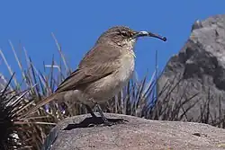 The plain-breasted earthcreeper (Upucerthia validirostris jelskii) is a bird in the family Furnariidae. It is found in Argentina, Bolivia, Chile, and Peru. Its natural habitats are subtropical or tropical high-altitude shrubland and subtropical or tropical high-altitude grassland. It has been lumped together with the buff-breasted earthcreeper based on song, continuous song, duet, and call.