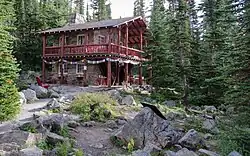 The Plain of Six Glaciers Tea House was built by the Canadian Pacific Railway (CPR) in 1924. The idea was suggested by Edward Feuz, a CPR Swiss Guide, as a rest stop for guests on their way to the Abbot Pass Hut. The main structure is a two-story stone building surrounded by wooden verandas that serves as the tea house. Three surrounding cabins that were built in 1927 once served overnight guests but now only house staff. The CPR invested $2,500 to build the establishment and licensed it to the Feuz family for operation. When the CPR began to sell or demolish all of their backcountry lodges in the 1950s, they hung on to the tea house until 1960. The tea house is now owned and run by Joy Kimball.[1]