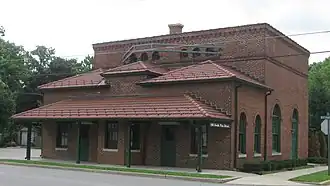 The building consisted of a small brick passenger / cargo depot in the front facing the street and track plus a large, two-story repair facility and power conversion AC to DC substation at the rear. Holes in the upper part of the substation walls are where electrical transmission wires entered and left. It has Italianate style design elements in the round arched window openings. The passenger depot section is topped by a series of red clay tile hipped roofs.