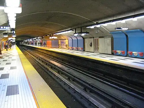Plamondon station is a Montreal Metro station in the borough of Côte-des-Neiges–Notre-Dame-de-Grâce in Montreal, Quebec, Canada.[4] It is operated by the Société de transport de Montréal (STM) and serves the Orange Line. It is located in the Snowdon neighbourhood of Côte-des-Neiges–Notre-Dame-de-Grâce. It opened on June 29, 1982 and replaced Côte-Sainte-Catherine station as the Orange Line's western terminus until the extension to Du Collège station was completed in 1984.