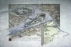 Wright's opera house was designed for his island site, which he intended to rename from Pig Island to Edena.[4] The island was to be connected to the mainland by two bridges. One, the Low Bridge, crossed the narrower west channel of the Tigris and met up with the planned King Faisal Esplanade; the line of the bridge and esplanade passed through the opera house and pointed toward Mecca. The larger Great Bridge was to cross the east channel of the river and connect the island to the university campus there.