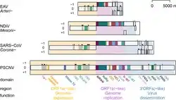 Uniquely among known nidoviruses, PSCNV also encodes several other identifiable protein domains, possibly acquired from the host. PSCNV encodes ribonuclease T2, two fibronectin type II domains, and three ankyrin repeats.[2]