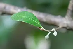 It is a small tree growing to 6 m, occasionally 10 m, in height, with a watery, white latex. The alternate, oval leaves are usually 40–80 mm long and 20–40 mm wide. The inconspicuous green flowers, 8 mm long, appear from May to July. The pointed, egg-shaped fruits are 13 mm long.[2]