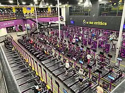 Planet Fitness, Inc. is an American franchisor and operator of fitness centers based in Hampton, New Hampshire.[4] The company has around 2,600 clubs,[5] making it one of the largest fitness club franchises by number of members and locations. The franchise has locations in the United States, Canada, Dominican Republic, Panama, Mexico, Spain and Australia.[6] It markets itself as a "Judgement Free Zone" that caters to novice and casual gym users.