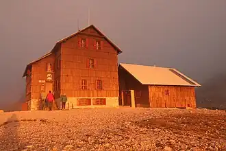 The Planika Lodge at Triglav (Slovene: Dom Planika pod Triglavom; 2401 m) is a mountain hut, which lies on the Ledine plains on the southern side of Mount Triglav. The First hut, also called the Triglav Tempe (Triglavski tempelj), was built on 18 September 1871. In 1877, the Austro-German hiking club built a hut called the Maria Theresa Hut (German: Maria Theresia-Hütte; Slovene: Koča Marije Terezije). On 13 August 1911, there was another building added called the Maria Theresa Lodge (Dom Marije Terezije). After World War I, the Slovenian Hiking club took over the hut and renamed it the Aleksander Lodge (Aleksandrov dom). The hut was transformed to a border garrison Karaula for a while. In 1945, the Gorje Hiking Club (PD Gorje) renamed it to Planika Lodge at Triglav. In 1987, Karaula was demolished and a bigger annex was built at its place on 19 August 1992.