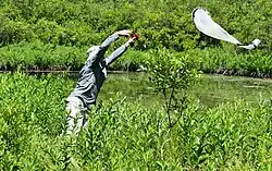 A plankton net is equipment used for collecting samples of plankton in standing bodies of water. It consists of a towing line and bridles, nylon mesh net, and a cod end. Plankton nets are considered one of the oldest, simplest and least expensive methods of sampling plankton.[1] The plankton net can be used for both vertical and horizontal sampling.[1] It allows researchers to analyse plankton both quantitatively (cell density, cell colony or biomass) and qualitatively (e.g. Chlorophyll-a as a primary production of phytoplankton) in water samples from the environment.