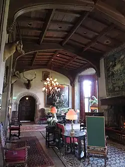 The property's first mansion burned to the ground on March 19, 1918; its replacement, the present Coe Hall, was constructed between 1918 and 1921 in the Tudor Revival style and faced in Indiana limestone. It was designed by the firm of Walker & Gillette and was completed in 1921. Images from a book of English country houses inspired its architecture, especially those of Moyns Park, Athelhampton, and St. Catherine's Court.