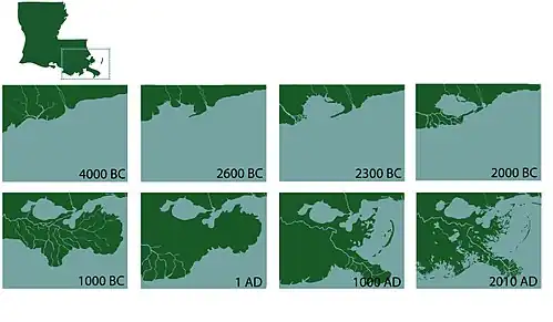 The formation of the Mississippi River Delta can be traced back to the late Cretaceous Period, approximately 100 million years ago, with the formation of the Mississippi embayment.[12] The embayment began focusing sediment into the Gulf of Mexico, which facilitated the deltaic land-building processes for the future. During the Paleogene Period (approx. 65.5 to 23 million years ago), a series of smaller scale, regional rivers entered present-day southern Louisiana allowing an increase in dispersion of sediment deposition into the delta region.[12] The Mississippi embayment then became a primary focus of sediment deposition during the Miocene Epoch (approx. 23 to 5.3 million years ago), which built the foundation of the modern delta region.[12] The modern day Mississippi River Delta plain began to evolve during the Holocene Epoch (around 7,500 to 8,000 years ago) due to the deceleration of sea level rise and the natural shifting of the river's course every 1,000–1,500 years.[7]