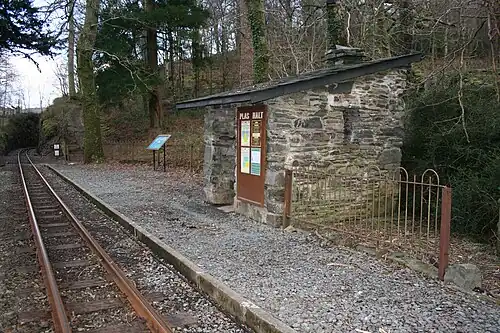 Plas Halt is an unstaffed halt on the narrow gauge Ffestiniog Railway in Wales, which was built in 1836 to carry dressed slate from Blaenau Ffestiniog to Porthmadog for export by sea.