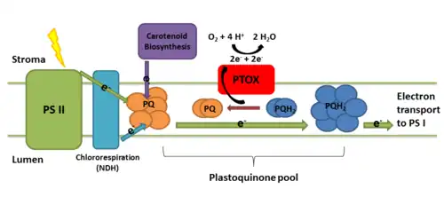 - ^ Trouillard M, Shahbazi M, Moyet L, Rappaport F, Joliot P, Kuntz M, et al. (December 2012). "Kinetic properties and physiological role of the plastoquinone terminal oxidase (PTOX) in a vascular plant". Biochim. Biophys. Acta. 1817 (12): 2140–8. doi:10.1016/j.bbabio.2012.08.006. PMID 22982477.