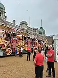 Pageant attendees with vehicles (including Daleks, motorbikes and bicycles) the buses and the celebrities riding them, first assembled at Horse Guards Parade in the early morning to prepare for the Pageant. This also included numerous interviews with news crews and journalists.