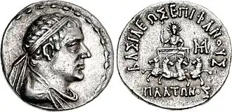 Plato Epiphanes (Ancient Greek: Πλάτων ὁ Ἐπιφανής, Plátōn ho Epiphanḗs, "Plato the God-Manifest") was a Greco-Bactrian king who reigned for a short time in southern Bactria or the Paropamisadae during the mid 2nd century BCE. The style of Plato's coins suggests that he was a relative — most likely a brother since Plato is a middle-aged man on his coins — of Eucratides the Great, whose rise to power is dated to around 170–165 BCE.