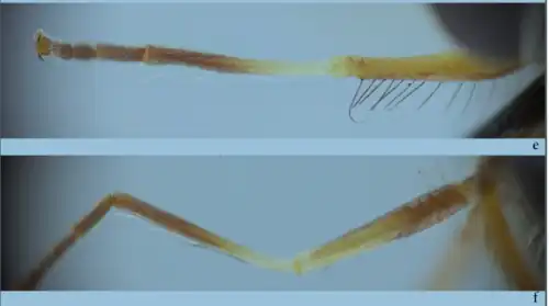 The hind femur is brownish black with a narrow, yellow apex. The hind tibia is dark except for the basal third. The hind basitarsus is less swollen and slightly thicker (1.2 times thicker) than the tibia at its apex. The tarsi are greyish-black.[6]